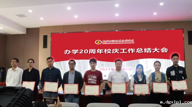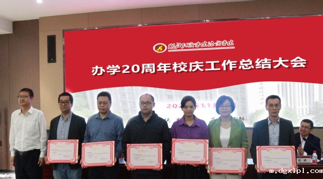 邓志华宣读学院《关于表彰办学20周年校庆工作先进集体和先进个人的决定》,学院办公室等6个先进集体和费关勇等30位教职工获得表彰。何慧刚分别为校庆工作先进集体和先进个人颁奖,并表示祝贺。