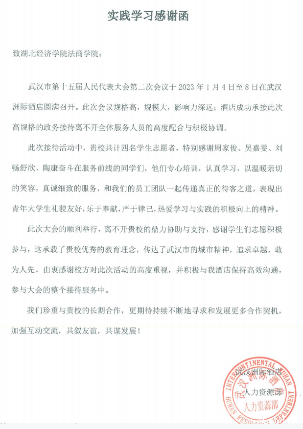 感谢函称,在武汉市2023年两会于武汉洲际酒店召开之际,我院旅游与酒店管理系周家峻、吴嘉雯、刘畅舒欣、陶康四位同学参加了会议志愿服务活动,四位学生以扎实的专业素养表现出我院学子礼貌友好,积极向上的青年大学生精神,并赢得了主办方的高度认可,深受会议组织者和与会者一致好评。该感谢函还表达了武汉洲际酒店愿与我院加强互动交流,长期合作,共叙友谊,共谋发展的美好祝愿。