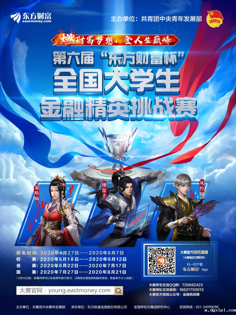 为深入学习宣传贯彻习近平新时代中国特色社会主义思想和党的十九大精神,全面贯彻落实习近平总书记关于青年工作的重要思想和团的十八大及十八届二中、三中、四中全会精神,加强对大学生的金融实践教育,帮助大学生掌握金融基础知识,增强金融安全意识,提高金融实践能力,完善就业创业素质,学院拟举办第六届“东方财富杯”全国大学生金融精英挑战赛校内选拔赛。现将大赛具体事项通知如下。