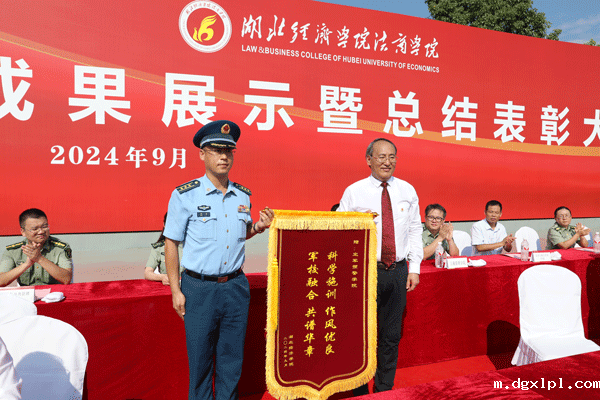 湖北经济学院党委常委、副校长张国安向承训部队赠送锦旗,张力代表空军预警学院学员四大队接旗。