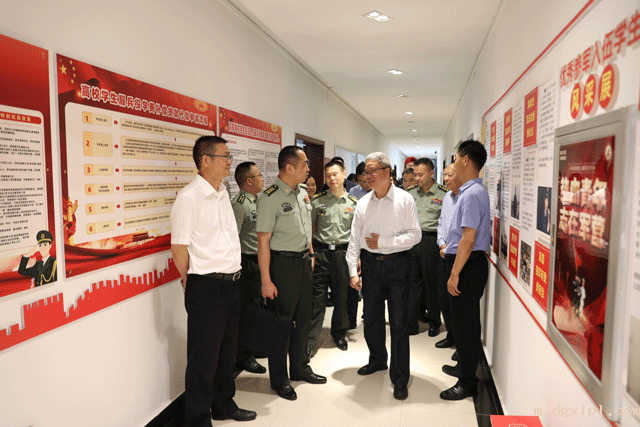 在征兵工作宣传展板前,一行人员听取了我院对征兵工作机构建设运行、兵员预征预储、征兵宣传、征兵经费安排使用、大学生参军激励措施等5个方面的情况介绍。并考察了我院大学生征兵工作站,退役大学生讲解员廖广卓、李菲菲分别就征兵工作站建设使用、功能区划分、军事类社团建设与作用发挥等方面作了详细讲解。