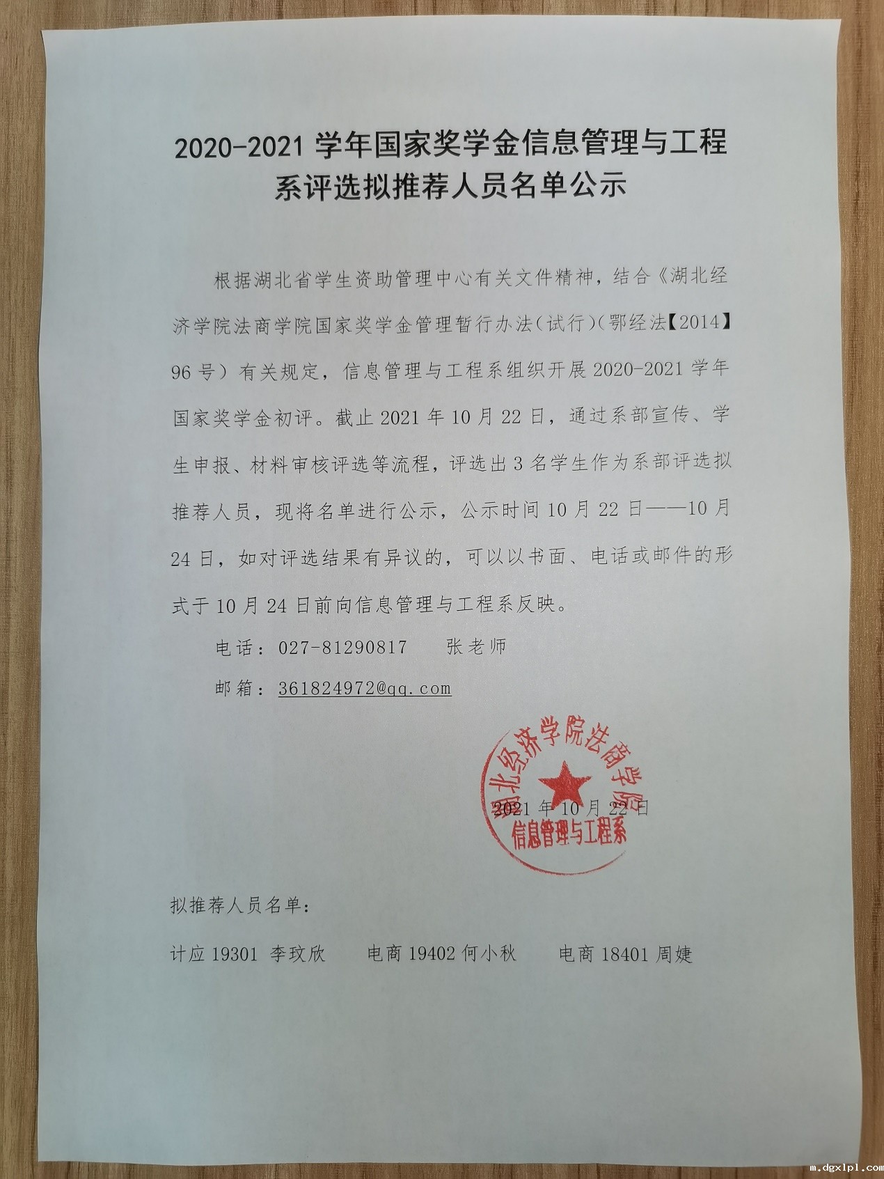 2020-2021学年国家奖学金信息管理与工程系评选拟推荐人员名单公示
