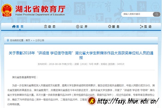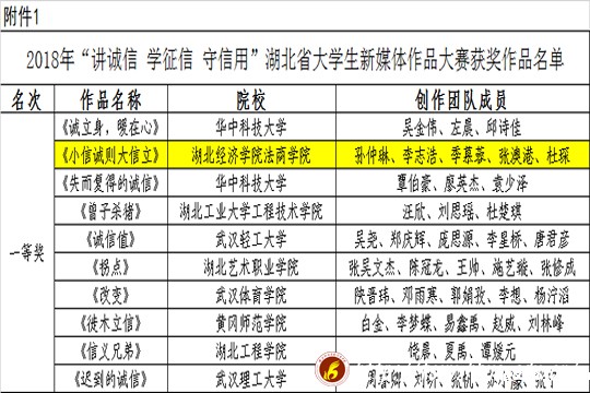 本网讯(通讯员 钟佩璇)8月9日,湖北省教育厅对2018年“讲诚信 学征信 守信用”湖北省大学生新媒体作品大赛获奖情况进行通报表彰,我院金融系学子孙仲琳、李志浩、季慕蓉、张澳港、杜琛等同学参与策划、拍摄的作品《小信诚则大信立》荣获了大赛一等奖和网络人气奖的好成绩。