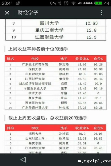 本网讯(记者 徐丽亨)持续了半个多月的第二届“中国银河杯”全国大学生金融挑战赛正在激烈的角逐中,我院金融系理财13303班冯煜同学在全国各高校五万余名选手中脱颖而出,稳居前列。此挑战赛从10月12日开始,截止到上周五,冯煜同学总收益率排名位居全国第12名,而上周收益率则排名全国第5名。