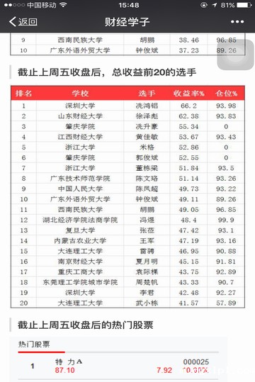 据悉,此次比赛参赛选手皆来自全国各大高校,其中不乏中国人民大学、复旦大学、中央财经大学等名校学生。我院在排名前100名的同学中除了冯煜还有其他若干参赛选手,均来自金融系金融学、投资学、金融管理与实务(金融理财)本、专科专业学生。