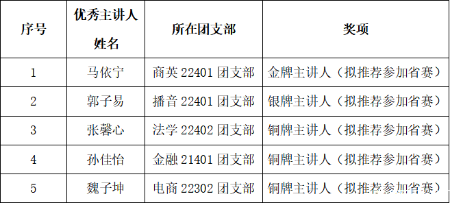 5月10日经院级决赛评选,拟授予马依宁等5名同学“优秀主讲人”荣誉称号并推荐参加省赛。现公示名单如下: