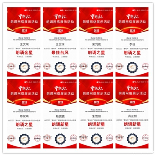 本网讯(通讯员 黄琪琪)近日,第六届“曹灿杯”全国青少年朗诵大赛以线上方式举行。我院传媒与艺术设计系9名师生参加国赛,8人获奖,其中王文瑞获朗诵金星奖及最佳台风奖,荣刘威、李恒、陈黛萌获朗诵之星奖,靳雯捷(指导老师)、朱雪阳、肖芷怡获朗诵新星奖。