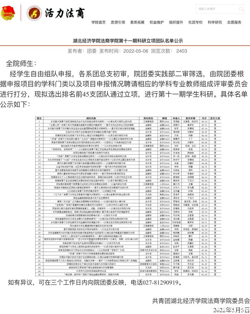 本网讯(通讯员 霍咏雯) JJB竞技宝平台官方下载第十一期科研立项团队名单自5月6日起已在我校官网公示。所公示的科研立项团队由院团委实践部审查打分产生,共有45支团队脱颖而出,我系视设21402的孙婷团队位列其中。